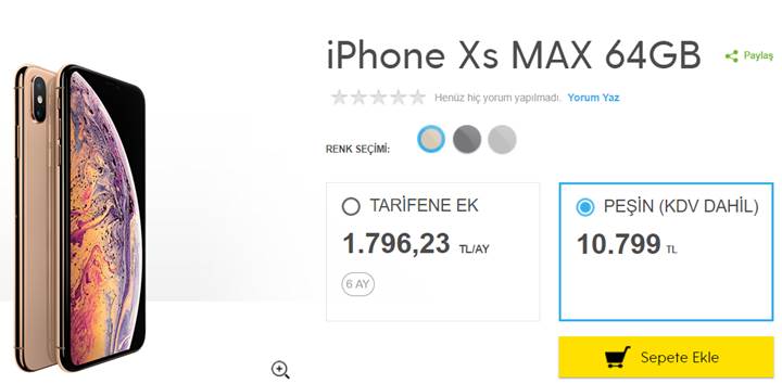 iPhone X’in güçlendirilen ve ekran boyutu büyütülerek 6.5 inçe ulaşan iPhone Xs Max’in 64 GB kapasiteli modelinin fiyatı 10799 TL, 256 GB kapasiteli modelinin fiyatı ise 12099 TL olarak belirlendi.